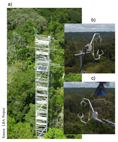 Some characteristics of the experimental site. (a) Micrometeorological tower located at Cuieiras reserve. (b,c) show 3-D sonic anemometer at 48 and 40 m above the ground. Source: http://lba2.inpa.gov.br/index.php/estacoes-de-pesquisa/zf-2-manaus/miss%C3%A3o-hist%C3%B3ria.html.