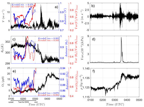 Figure 2 shows that around 0330 UTC (13 April 2014) the horizontal wind velocity increases five-fold (Figure 2a), vertical wind velocity abruptly increases (Figure 2b), values falls 4 K (Figure 2c), abrupt change in the variance of the barometric surface pressure (Figure 2d), -mixing ratio increases by 10 ppvb (Figure 2e), and sudden increase in air density (Figure 2f). The blue and red lines in Figure 2a,c,e correspond to the autocorrelation function and variance values, respectively, at a moving window calculated for one-point (1 s) increments. Simultaneous increases occur in both autocorrelation and variance function values for all state variables in which the conditions required for critical transition are met (fall in , and sudden increases in horizontal wind speed and -mixing ratio). The other four nights also investigated in this work are presented in the supplementary material.
