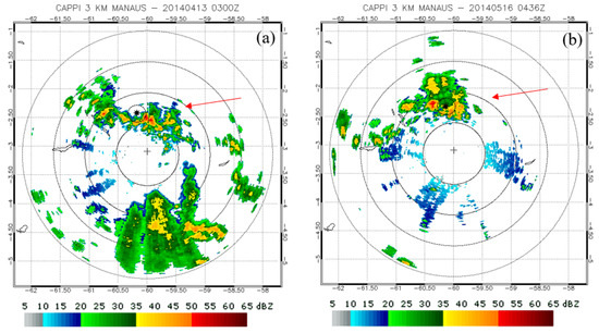 Radar images showing the pattern of cloud cover around the experimental site in periods during occurrences of EP in (a) 13 April 2014 at 03 UTC and (b) 16 May 2014 at 0436 UTC. The red arrow indicates the direction of the cloud motion and the black point corresponds to the approximate location of the meteorological tower K34. The color bar indicate the corrected equivalent reflectivity factor (dBz). Source: https://iop.archive.arm.gov/arm-iop/2014/mao/goamazon/T1/schumacher-sband_radar/.