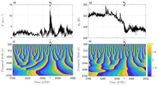 Time series measured at 48 m in 13 April 2014: (a) Horizontal wind speed (V); (b) equivalent potential temperature (). Phase of the Morlet wavelet: (c) of V and (d) . The arrows indicate the main phase singularity (during EP).
