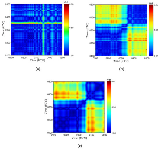 Figure 5 presents three recurrence graphs corresponding to the three turbulent variables (V, and mixing ratio, respectively) selected for this study. The time interval used for the recurrence analyzes was from 01 to 05 UTC. A change of dynamics in the data series can be observed around 0330 UTC for all three turbulent variables used. A sudden change in the dynamics of the system can be observed around 0330 UTC, in which there is an intensification of hotter bands in the recurrence graph for the three turbulent variables used. After this time (around 0330 UTC) the structure resembling a chess board that individualize recurrence processes are no longer verified. These changes in texture patterns provide indications of the occurrence of a transition between two qualitatively distinct states.