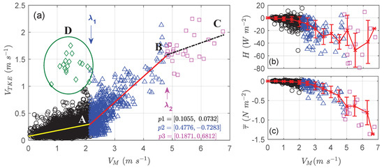 Figure 6b shows the behavior of the flux H over each one of the turbulence regimes presented in the Figure 6a. It is possible to verify that the more intense turbulence regimes are also responsible for the higher intensities of the sensible heat fluxes, which reach −80 W m−2 in the very strong turbulence regime. In Figure 6c, the intensity of the vertical flux of u-momentum follows a growing trend for the three turbulence regimes identified in Figure 6a. The red lines shown in Figure 6b,c correspond to the average values of H-turbulent fluxes and momentum flux obtained at each 0.5 m s interval for the wind speed and their respective standard deviations. However, for the very strong turbulence regime, an interval of 0.8 m s was used due to less data. It is noted that this increasing tendency in momentum flux is not very evident during the weak turbulence regime (black circles), but it becomes clear with the occurrence of the strong turbulence regime (blue triangles), following the same trend during the occurrence of the “very strong” turbulence regime, up to the 7.0 m s observed upper limit of velocity.