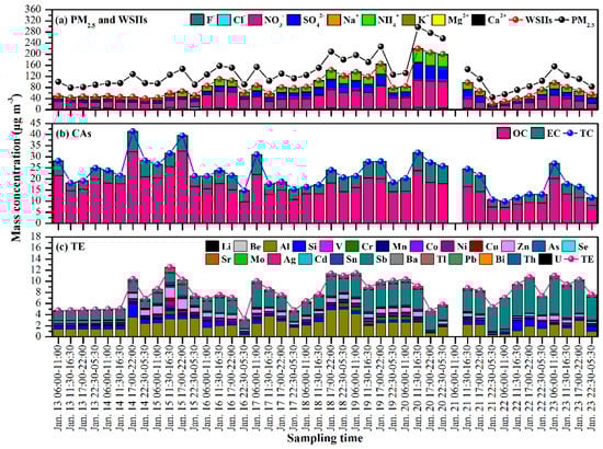 Figure 2 presents the time series of mass concentration of PM2.5, WSIIs, CAs, and TE during 13–23 January 2018 at Xiantao site. There was low atmospheric visibility (2.34 km) for 13–23 January and Xiantao experienced an eleven day-long haze episode with an average daily PM2.5 mass concentration of 132 ± 56.0 μg m−3. This level was higher than the levels (123 μg m−3) in January from 2012–2017, and approximately 1.76 and 2.49 times higher than the Grade II of NAAQS and the “normal” levels (53 μg m−3) without pollution events there in January 2018 (http://sthjt.hubei.gov.cn/fbjd/zwgk/jcsjfb/hjkq/), respectively, indicating a heavy PM2.5 pollution during wintertime in JHP, central China. The average daily WSIIs, OC, EC, and TE concentrations were 83.6 ± 46.7, 16.4 ± 5.75, 5.56 ± 1.78, and 7.97 ± 2.36 μg m−3, respectively. The PM2.5 mass concentrations during severe pollution period (277 ± 20.2 μg m−3) was approximately 2–3 times higher than the levels during mild, moderate, and heavy pollution periods (95 ± 10.5, 131 ± 8.52, and 175 ± 27.3 μg m−3, respectively).