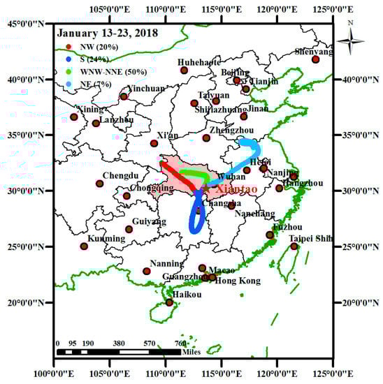 Four simulated clusters for 3 days (72 h) air masses back trajectories every four times a day at 500 m A.G.L using HYSPLIT model (https://www.arl.noaa.gov/hysplit/) during 13–23 January 2018 at Xiantao site.