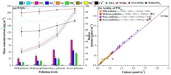 The acidity of PM2.5 (Supplementary Text S1) could be roughly evaluated through the balance of anions and cations [42]. The average anions/cations ratios during mild, moderate, heavy, and severe pollution periods were 1.04 ± 0.06, 1.00 ± 0.09, 1.05 ± 0.02, and 1.09 ± 0.03, respectively. All these ratios approached 1 and strong positive correlations (r = 0.93, 0.86, 0.99, and 0.82, respectively, p < 0.05) between anions and cations were observed at different pollution levels in Xiantao (Figure 4b), which indicated that almost all the WSIIs were identified and these WSIIs were important alkaline and acidic species in the PM2.5 aerosol [43]. Moreover, all these ratios were also greater than 1, which may be due to a deficiency of H+ in the calculation and/or to NH4+ being converted into the gaseous phase [22]. The anions/cations ratios is also a good indicator for studying the acidity of PM2.5 aerosols [22], which indicated that the PM2.5 aerosols were acidic during the winter haze episode in Xiantao.