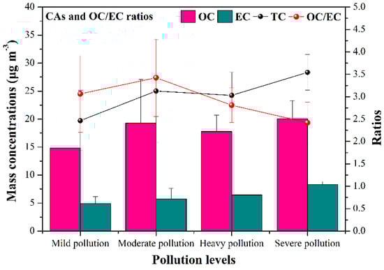 Dynamic variations of CAs (OC, EC, and TC) and OC/EC ratios at different pollution levels at Xiantao site.