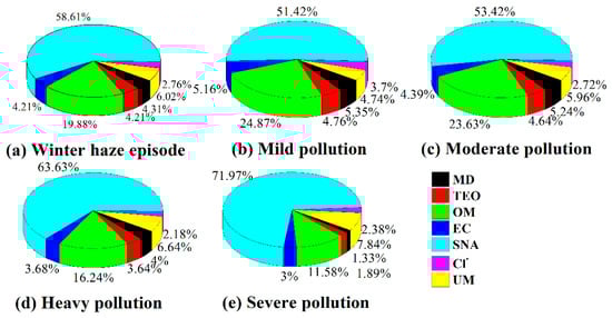 The chemical mass closure method (Supplementary Text S3) was used to better understand PM2.5 chemical compositions, including mineral dust (MD), trace element oxides (TEO), OM, EC, SNA, Cl− and unidentified matters (UM) [51,52,53]. Figure 7a–e presents the chemical mass closure for PM2.5 at different pollution levels at Xiantao site. As shown in Figure 7a, SNA occupied the largest proportion (58.6%) of PM2.5, followed by OM (19.9%), MD (4.31%), EC (4.21%), TEO (4.21%), and Cl− (2.76%). The contributions of MD, TEO, OM, EC, and Cl− to PM2.5 decreased as the pollution levels increased, whereas the contribution of SNA to PM2.5 increased as pollution levels increased (Figure 7b–e). The results may indicate the contribution variations of emission sources to PM2.5 chemical compositions. On average, only a small proportion of PM2.5 (UM, 6.02%) cannot be identified in this study as well as each pollution level, which indicated that the chemical masses of PM2.5 aerosol samples were balanced during the winter haze episode in Xiantao.
