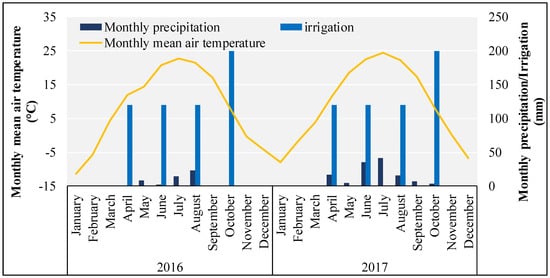 The air temperature, precipitation, and irrigation of study site in 2016 and 2017.