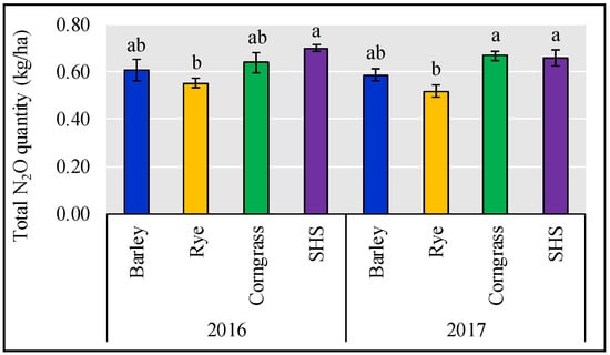 The total soil N2O flux from barley, rye, SHS, and corngrass fields during growing seasons in 2016 and 2017. Means with the same letters are not significantly different (P > 0.05).