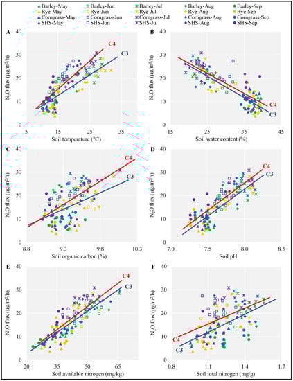 The linear regressions between soil N2O fluxes and soil properties of soil temperature (A), soil water content (B), soil organic carbon (C), soil pH (D), soil available nitrogen (E), and soil total nitrogen (F) in barley, rye, corngrass, and SHS fields. The statistical results are summarized in Table 2 for each species and in Table 3 for C3 and C4 species.