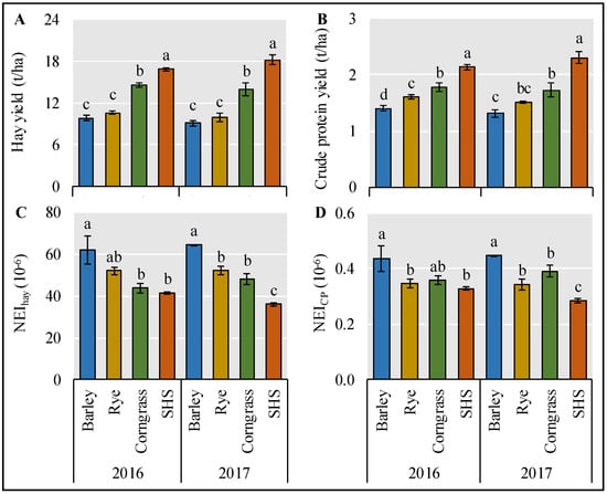 Mean (±SE) hay yield (A), crude protein yield (B), NEIhay (C), and NEICP (D) (N2O emission intensity, i.e., yield-scaled N2O emission) for barley, rye, corngrass, and SHS in 2016 and 2017. For each category and each year, means with the same letters are not significantly different (P > 0.05).