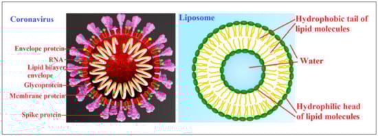 Schematic of an enveloped coronavirus and a liposome with a lipid bilayer membrane. Adopted from https://en.wikipedia.org/wiki/Coronavirus and https://es.wikipedia.org/wiki/Liposoma.