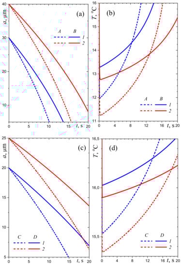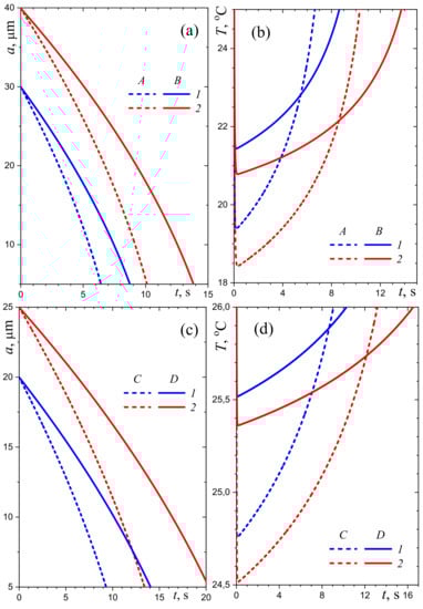 Time-dependency of the droplet radius and temperature (a,b) at low RH of air (A—20%, B—40%; 1— µm, 2— µm) and (c,d) at high RH of air (C—70%, D—80%; 1— µm, 2— µm); °C.