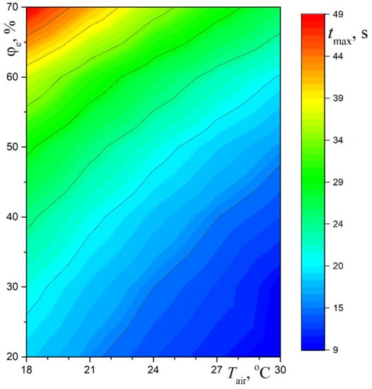 It is of interest to generalize the numerical data for evaporating water droplets with an initial radii in the range from 10 to 40 µm in the form of the dependence of the maximum residence time, , of water droplets (possibly containing viruses) at a dangerous altitude on two key parameters: temperature and relative humidity of ambient air. The calculated values of for moderately warm and hot weather with not too high relative humidity of air are presented in Figure 4.