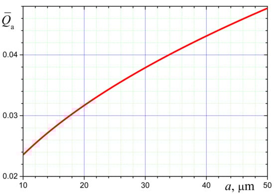 where n and κ are the spectral indices of refraction and absorption for water, and is the diffraction parameter of a droplet. The dependency of on the droplet radius is presented in Figure 5. Small values obtained are due to water droplets transparency, which is caused by a very small value of the water absorption index in the visible spectral range [68]. For the same reason, the degree of the exponent in Equation (17) is significant only in the infrared part of the spectrum, which makes the dependency of on the droplet radius almost linear.