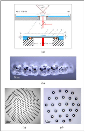 In this section, we will describe the droplet cluster technology which can be used to trace individual aerosol droplets and which has already been discussed in [15]. In order to generate a levitating droplet cluster, a water layer with the thickness of 0.4 mm is typically used. A small area on the surface of the layer can be heated by a laser beam (Figure 6a).