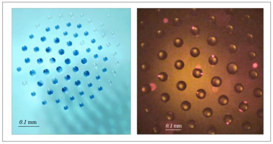 In the past, we conducted an investigation of bioaerosols in stabilized droplet clusters with an Axio Zoom V16 fluorescence microscope (light source HXP 200C, filter set 38 HE, camera pso.edge 5.5, Zeiss, Jena, Germany) [15]. Microorganism cells (a green microalgae, Chlorella vulgaris, and of non-pathogenic Escherichia coli) bacteria were encapsulated into the droplets by ultrasound spreading (Figure 7). We visualized treated bacterial cells with a permeabilized membrane employing a commercial staining kit containing DNA-intercalating dyes. The dyes allow to distinguish between the living and dead cells. The lightweight green fluorescence SYTO 9 (~400 Da) freely penetrates even through integral bacterial membrane, in contrast heavier red fluorescence PI (668 Da) is accumulated inside only through disordered plasma membrane. Membrane disordering was spectroscopically recorded as quenching of the green fluorescence since the SYTO 9 replaces by PI. The cells with undamaged membranes emit green light, while breaking of the cell membrane causes a chemical reaction and the color changes for red.