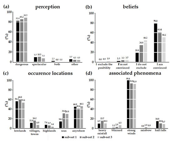 - In terms of basic knowledge, the ability to identify the tornadoes increases with direct experience in the atmospheric sciences, and the same trend can be observed with regards to the belief that tornadoes occur in Romania. The perception of danger, occurrence locations and the most dangerous associated phenomena show a similar pattern. It is very likely that the background level of knowledge and interest in tornadoes is a major triggering factor both for identifying the danger and for the immediate reaction of a person.
