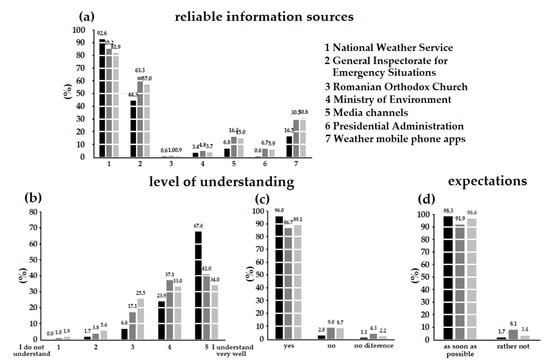 - In terms of trust in information sources, although in general the most reliable source is the National Weather Service, a decreasing trend is visible from sub-set 1 to sub-set 3, while the opposite trend is evident for mobile phone weather apps. One can assume that the level of literacy in meteorology is also important for using and trusting official sources (e.g., National Meteorological Administration).