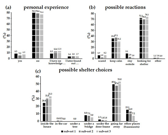 - There are notable differences regarding the possible reactions and shelter choices. People in sub-set 3 would be less calm, would not stay outside and would be more focused on looking for a shelter (preferably inside the house), or going far away, more so than people from sub-sets 1 and 2.