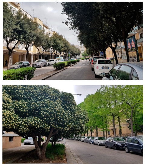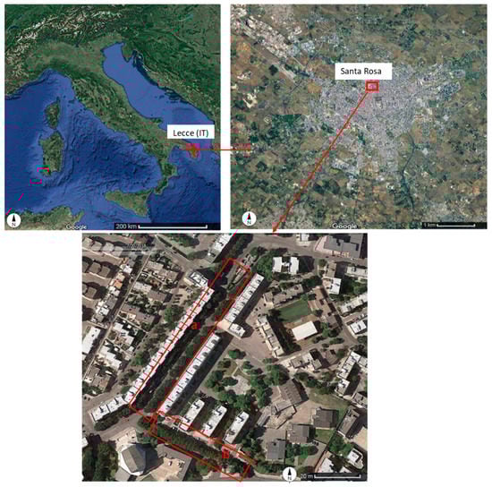 The city of Lecce (UTM coordinates: 40°21′7.24″ north (N), 18°10′8.9″ east (E)), a medium-sized city representative of Mediterranean cities in terms of architectural design and climate, is located in southern Italy (Figure 1, top). With 96,534 inhabitants [54], it is built on flat land, approximately 40–50 m above sea level (a.s.l.). In the Köppen–Geiger classification, Lecce belongs to the Warm Mediterranean Climate Csa class, with dry and hot summers, due to the domination of subtropical high-pressure systems, and mild and wet winters with moderate and changeable temperatures. The Mediterranean region is potentially vulnerable to climatic changes because it is affected by interactions between mid-latitude and tropical processes, being in a transition zone between the arid climate of North Africa and the temperate and rainy climate of central Europe [55]. The urban morphology is characterized by two- to three-story buildings and narrow street canyons [56]. The city has been the object of studies (some of them considering the effects of vegetation) analyzing microclimate and air quality using both experimental and modeling approaches. Some of the most recent papers are reported here.