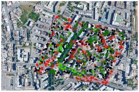 In this paper, once the area was defined, the various ground-cover classes were set, i.e., the various types of coverings and urban elements: deciduous and evergreen species, cemented surface (including sidewalks and various cement surfaces, buildings, roads, and any paved surface), grass/herbaceous (although vegetation, the default settings of the model do not consider it as vegetation cover but as a surface), and soil (areas covered by uncultivated land). In total, 847 randomly sampled points were considered within the study area, as shown in Figure 2.