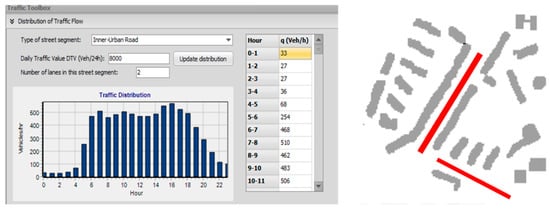 To represent pollutant sources derived from vehicle traffic, the “traffic” tool was used by setting, as an example, the number of vehicles in the 24 h (8000 vehicles by default for an inner urban road) and the pollutant of interest (as an example, NOx considered as a passive pollutant [15]). The sources were linear, and, to mimic mixing by traffic-induced turbulence, the emission was distributed over the entire dimension of the traffic lane at the height of 0.5 m. The maximum emission rate (at 15:00) was 17.96 ug/m·s, while the emission rate at 7:00 p.m. (hour when the maximum concentration at a selected point was found; see Section 4.3.1) was 14.11 ug/m·s. Traffic distribution and source locations are shown in Figure 3.