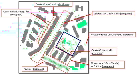 - Species and their arrangement: two rows of Quercus ilex L. subsp. ilex in street canyon “a” and one row of Tilia sp. in street canyon “b”;