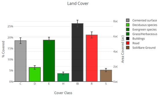 Figure 6 shows the percentages of ground cover with their standard errors (SE). The characterization shows that evergreen species are present in greater number (18.77%) than deciduous species (6.38%). In total, the green cover is equal to 25%. The data referring to buildings and asphalt cover are consistent, being an urban district. A first analysis shows that the cemented area has a coverage percentage of 18.54%, almost equal to the area occupied by evergreen species.