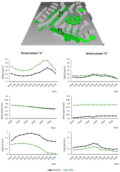Figure 7 shows the hourly profiles of NOx concentration, wind velocity, and turbulent kinetic energy (TKE) calculated at pedestrian height at points P1 (street canyon “a”) and P2 (street canyon “b”). For all the scenarios in street canyon “a”, the concentration during the day is lower than that in the late afternoon. The valley and peak occur at 1:00 p.m. (VEG: 29.55 µg/m3; NOVEG: 15.40 µg/m3) and 7:00 p.m. (VEG: 56.97 µg/m3; NOVEG: 37.34 µg/m3), respectively. The valley shows a “U” shape, which means that the NOx concentration is maintained at a relatively lower level within 3–4 h. It is interesting to note that, at 3:00 p.m., the concentration is still low although the emission rate was maximum. This is because the higher wind speed and TKE during the day (associated also with higher temperatures, not shown here) cause the pollutant to disperse more rapidly. In street canyon “b”, the hourly profiles of concentration, wind speed, and TKE are sharper, with a higher concentration at 3:00 p.m. (VEG: 20.43 µg/m3; 18.10 µg/m3) mainly associated with a larger TKE.
