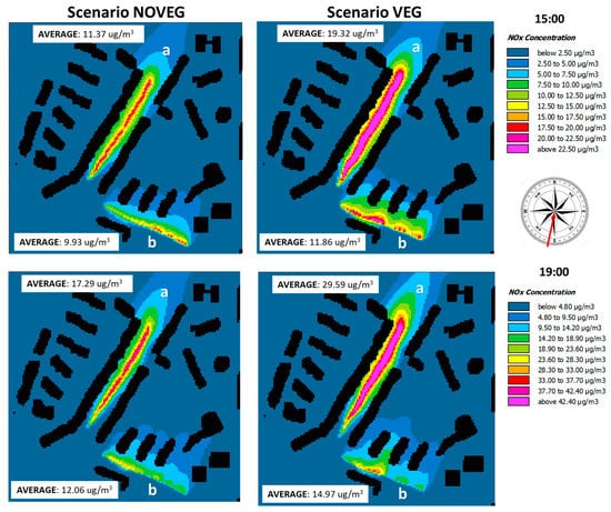It is evident that, in both street canyons, the vegetation scenario experiences higher concentrations than those found in the no-vegetation scenario. The effect of the presence of urban greening is more significant in street canyon “a”, where the concentration increase is about 90% during the late morning (up to 3:00 p.m.) and about 50% at 7:00 p.m., while, in street canyon “b”, the concentration increase is about 30% during the morning and mid-afternoon, and it decreases to about 10% or less at 3:00 p.m. and in the late afternoon. Finally, the NOx concentration in street canyon “a” is, in general, higher than in street canyon “b”, and this is likely due to the longer street (and, thus, line source) with the emission rate being the same for both street canyons.