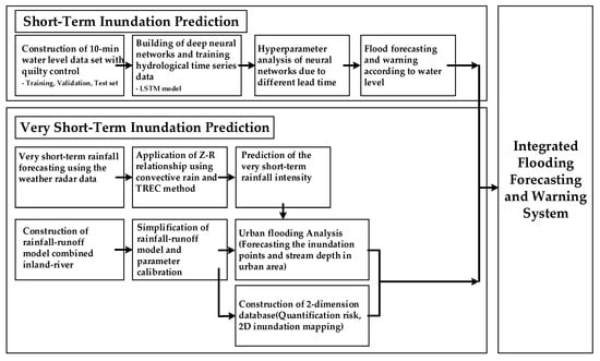 A real-time flood forecasting and warning can proactively convey a powerful message about the warning of flash floods and inundation depths in urban areas, together with the effectiveness of possible countermeasures to citizens and civil servants. Therefore, we developed the integrated flood forecasting and warning system combined inland-river that systematized technology to quantify flood risk and flood forecasting to provide effective flood warning in the urban area. It consisted of the short-term inundation prediction module with data-driven method and the very short-term inundation prediction module with model-driven method. LSTM was used to predict the stream depth in the short-term inundation prediction and very short-term rainfall prediction by radar data, construction of a rainfall–runoff model combined inland-river by coupled SWMM and HEC-RAS, automatic simplification module of drainage networks, automatic calibration module of SWMM parameter by DDS, construction of the 2-dimension inundation database by various rainfall scenario to warn inundation risk areas were used in very short-term inundation prediction to warn and convey the flood-related data and information to communities.