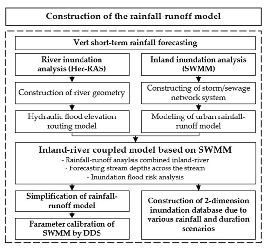 The critical technology of the very short-term inundation prediction module is divided into five parts: (A) forecasting rainfall using radar data; (B) constructing rainfall-runoff model of drainage networks combined inland-river; (C) simplification of the rainfall-runoff model using automatic simplification module; (D) parameter calibration of Storm Water Management Model (SWMM) using DDS and (E) setting up the 2-dimension inundation database. In the first step, the short-term rainfall forecasting using the radar data was implemented. It can be estimated for 10 min to 120 min before rainfall prediction with 10 min lead time using the Tracking Radar Echoes by Correlation (TREC) technique. In the second step, the rainfall-runoff model of drainage networks combined inland-river was built using coupled SWMM and the Hydrologic Engineering Center—River Analysis System (HEC-RAS). In the third step, the rainfall-runoff model, which is made the whole drainage networks in Dorim, was simplified by automatic simplification method. In the final step, the parameters of the SWMM model were calibrated automatically using a DDS to improve parameter uncertainty. The 2-dimension inundation database was built in advance by the rainfall-runoff model made of whole drainage networks in an urban area based on different rainfall and durations scenarios and it has been chosen and provided according to prediction rainfall by radar.