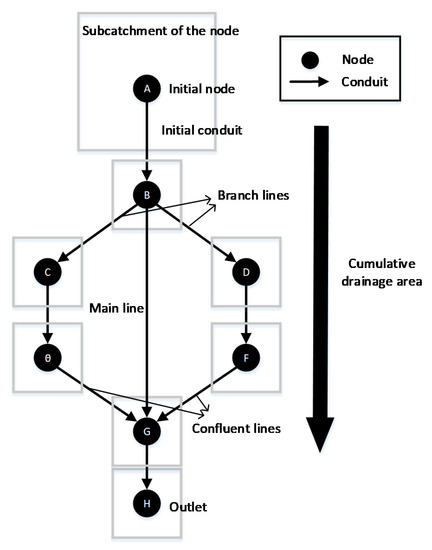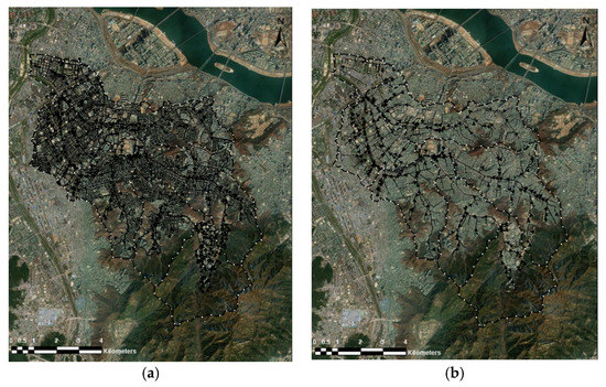 The Seoul Metropolitan City manages a total of 34 inundation-vulnerable areas. Among them, Dorim basin, which was chosen as the target watershed, is the one of the inundation-vulnerable districts and has small-scale stream. Dorim basin has an area of 42.5 km2 and the Dorim stream has a length of 14.51 km (Figure 4). Upstream catchments of watersheds in Dorim stream are mountainous with steep land slopes, the surface runoffs concentrate rapidly to channel flowing into the downstream urban area once the storm rainfall starts. So, flash flood frequently causes loss of human life and property in this area. Figure 5 shows the rainfall–runoff model of drainage networks in Dorim basin. In result of the constructing drainage networks (all basin of Dorim area), the number of conduits is 32,471 (Figure 5a). After simplification, the number of conduits is 243 (Figure 5b). Although the number of conduits substantially decreases as the criteria of the cumulative drainage area, it was presented that SWMM parameters was calculated automatically and basin area was the same as before the simplification.