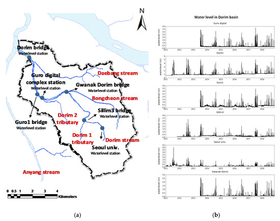 Locations of the Dorim basin. (a) Location map of water level stations in Dorim stream; (b) water level data with quality control in Dorim stream.