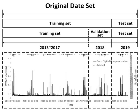 A calibration strategy of training set, validation set, and test set size ratio is important to present statistically significant results. However, since before getting great performance, it is not easy to determine the statistical significance. Nevertheless, since approximate values of the error rates of time-series data forecasting on similar tasks are known, it is possible to estimate what reasonable size a test set should have [28]. In this study, the data sets were divided based on the number of rainfall events. Data from 2011 to 2017 were the training dataset, data in 2018 were the validation dataset, and data in 2019 were the test dataset (Figure 7).