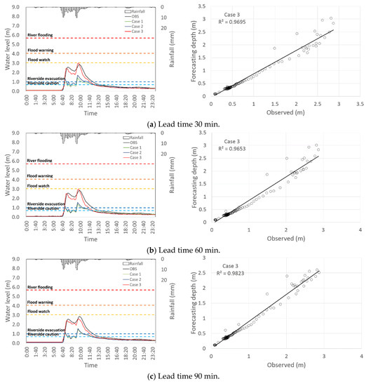 Tributaries inflow have a substantially influence on forecasting results of water level by LSTM. Therefore, we have constructed the training sets with various input combinations to consider tributaries inflow. They showed the training group due to water level data (Table 4) and the accuracy of the forecasting result. The module of the short-term inundation prediction was carried out with LSTM on 26 July 2019. The forecasting results for Cases 1, in which training was performed using only one upstream depth data, did not reflect good forecasting model performance because other streams flow into Dorim stream. However, the forecasting results obtained with depth data of two points, case 2 showed better accuracy than case 1 result. Moreover, the forecasting results for Case 3, which involved the training with depth data of three points, indicated the best performance. It means that tributary data is very important to predict downstream depth in Dorim basin. Case 3 also presented that if sufficient depth data are acquired and the data quality is improved, the forecasting result based on depth data can reflect sufficiently good performance. Through these results, the LSTM with training three points water level stations was selected as forecasting model of short-term inundation prediction module. After quantitative and qualitative analysis of LSTM, we also scatter the observed and simulated water level values (Figure 8). The values LSTM R2 are 0.9695, 0.9653, and 0.9823, respectively due to lead time. The LSTM has high values of R2 indicating that this model could well reflect the relationship between observed and forecasting depth so that forecasting model with lead time 90 min is quite possible to predict and warning stream flooding. It is sufficiently can warn and evacuate the resident if accurate water level prediction with 90 min lead time is led in flash rainfall.