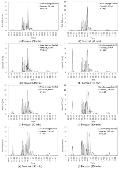 Predicted areal average rainfall by radar due to forecast lead time in Dorim basin. (a) Forecast (10 min). (b) Forecast (20 min). (c) Forecast (30 min). (d) Forecast (40 min). (e) Forecast (50 min). (f) Forecast (60 min). (g) Forecast (70 min). (h) Forecast (80 min). (i) Forecast (90 min). (j) Forecast (100 min). (k) Forecast (110 min). (l) Forecast (120 min).
