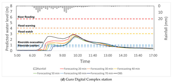Rainfall forecasting results by radar in the very short-term inundation prediction were applied. This module generated the forecasting rainfall with from 10 min to 120 min lead time for the Automatic Weather station (AWS) 8 points of KMA near Dorim basin. After that, it converted to the areal average rainfall and the accuracy of forecasting results was compared with that of AWS rainfall data on 26 July 2019 (Figure 9). As a result, the forecasting results until 70 min were good predicted, the accuracy from 80 min began to decrease sharply. Among these forecasting results, the 40 min forecasting rainfall result predicted by radar was applied to the simplified rainfall–runoff model to calculate the stream depth and accuracy of analyzed results was examined. The analysis points were selected as the water level stations in Dorim basin (Seoul University, Sillim3 bridge, Gwanak Dorim bridge, Guro Digital Complex station, and Guro1 Bridge). Figure 10 shows that analyzed stream depth results were compared with the data of water level stations on 26 July 2019. Table 5 makes the comparison of performances of SWNN rainfall–runoff model for stream depth prediction. This is the quantitative analysis of the SWMM model using four preference criteria. Due to the characteristics of predicted rainfall results by radar, which did not predict the initial rainfall well, R2 and NSE of the upstream where Seoul University is located were relatively low, but the predictive performance of the downstream, Gwanak Dorim, and Guro 1 bridge was 0.80 and 0.81, respectively, at 40 min lead time which presented good prediction performance. After 50 min lead time, the values of MAE and RMSE are all increased sharply. These cases illustrate that the 40 min lead time is the most appropriate time to forecast and warn urban flooding.