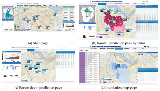 Integrated flood forecasting and warning system in web page Ref [29]. (a) Main page. (b) Rainfall prediction page by radar. (c) Stream depth prediction page. (d) Inundation map page.