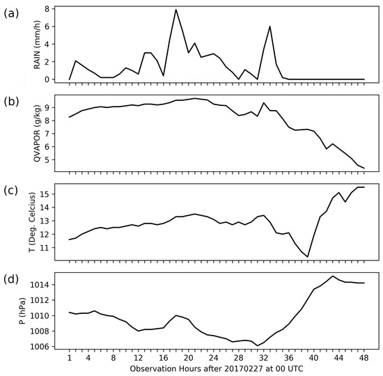 Observation data from the Lopez Zamora Station: (a) precipitation in mm/h, (b) water vapor mixing ratio in g/kg, (c) temperature in degree celsius, and (d) pressure in hPa. The horizontal axis represents the hours after 27 February 2017 at 00 UTC.