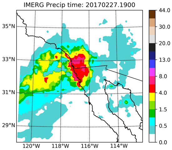 NASA Global Precipitation Measurement (GPM) Integrated Multi-satellite retrievals for GPM (IMERG) [33] precipitation data inter-calibrates, merges, and interpolates satellite microwave precipitation estimates, together with microwave-calibrated infrared satellite estimates, and precipitation gauge analyses, to form a spatio-temporal dataset. The IMERG product used here was the 3IMERGHH product, which provides precipitation estimates every 30 min at a spatial resolution of 0.1, corresponding to ∼11 km. We integrated the precipitation data into hourly estimates without modifying the product’s spatial resolution. Figure 3 shows the hourly precipitation data for the study area, corresponding to 19 UTC of 27 February 2017, when the ZMS reported the most intense precipitation.