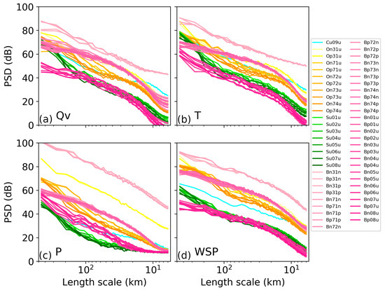1-D power spectral density in dB of the water vapor (a), temperature (b), pressure (c), and wind speed (d) perturbation fields in the sigma level closest to the surface at 00Z on 27 February 2017 for each member of the ensemble system. The frequency domain (horizontal axis) is expressed in terms of distance in km.
