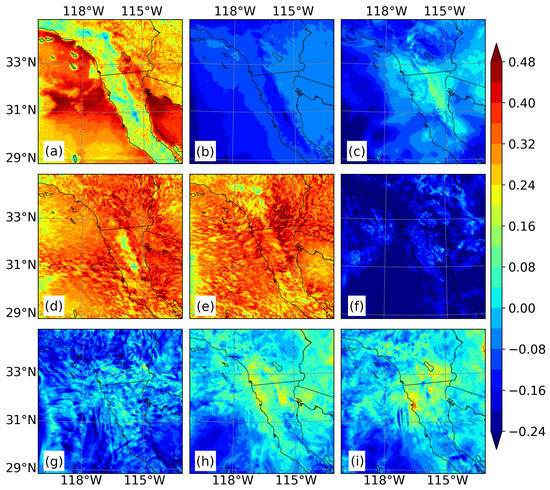 Since results in Figure 4 are averaged in horizontal space, Figure 6 displays the vertically and time-averaged growth rate for some ensemble members. Here, the member with different physics (Cu09u, Figure 6a) had positive growth rates throughout almost the entire domain. However, the higher values appeared over the Pacific Ocean and on the northern Gulf of California. This behavior might be associated with thermal and dynamic instabilities generated as a response to the differences between this member’s and the control’s physic parameterizations. Members using SKEBS (Figure 6d,e) also had positive values but showed no definite pattern of the growth rate fields because their perturbations were randomly computed. All members had different patterns in the growth rate average field without any preferred location for their extrema. For its part, randomly-perturbed members using CV3 (e.g., Figure 6b) presented negative growth, and their breeding counterparts (Figure 6f for the given case) showed even lower values. The randomly-perturbed members using CV7 and associated breeding members (Figure 6c,g) showed areas of positive growth rates over land, and even more so, the breeding members coming from SKEBS simulations (see Figure 6h,i). The latter implies that these breeding members could still be useful in an ensemble prediction system because their perturbation growth over areas of interest might have increased its spread. The localized, positive growth rates in Figure 6c,g–i were associated with the convective instability that characterized this case study.