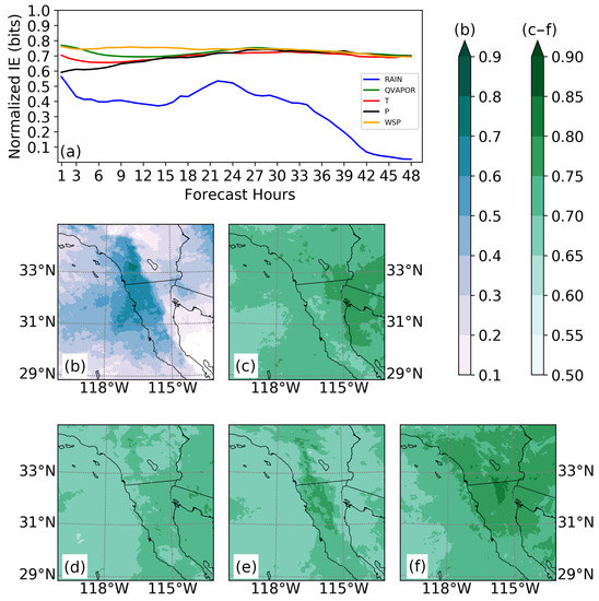 Temporal evolution (a) and spatial distribution (b–f) of information entropy computed for rain, temperature, water vapor, pressure, and wind speed from (b–f), respectively. Valid for the simulation period starting at 00Z on 27 February 2017.