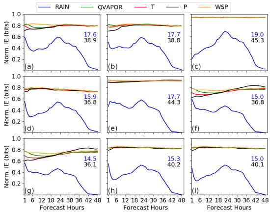 The amount of useful information the ensemble has according to its members, the information entropy (IE), Equation (2), is plotted in Figure 7, normalized with the maximum theoretical value of this ensemble. A value of one would indicate that all members contributed equally to the ensemble, i.e., each member provides the same amount of useful information. A value of zero indicated that only one member was sufficient to describe the meteorological conditions because the model was certain about the outcome. The evolution of the spatially-averaged IE appears in Figure 7a, while the time-averaged IE is shown in Figure 7b,f, for all five meteorological variables analyzed in this study.