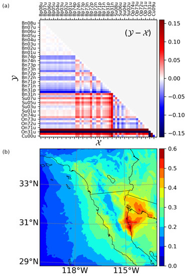 Generally, the ensemble presented here is under dispersive, i.e., the ensemble spread does not provide a good estimate of forecast error, with a few outliers such as the members using CV3 random perturbations. These initial perturbations were characterized by large spatial wavelengths, which is probably why they presented the smallest growth rates. The breeding members coming from SKEBS could have some value, particularly in areas of atmospheric instability. Their spread and growth rate could increase after a few breeding cycles, as the literature suggests [12]. However, in this case, it was noted that the domain average growth rate is negative, leading to little dispersion between these members. Moreover, the mean biases between members are small, especially for the breeding members. They are more substantial and more variable among SKEBS simulations, and peak, in absolute terms, for water vapor mixing ratio and wind speed. The average spread of the ensemble is spatially variable with locally higher values, as a response of the atmospheric conditions and characteristics of the simulation domain. For example, the largest dispersion areas of the ensemble precipitation appear in regions with intense rainfall. With water vapor, the spread is larger over the northern Gulf of California. It should be noted, however, that the standard deviation values are rather low. Meanwhile, the other variables show larger spreads leeward of the mountain systems northern of the peninsula and south of California.