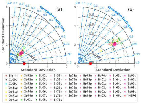Taylor diagrams for precipitation computed from IMERG hourly data used as a reference. WRF data is taken from (a) the domain point closest to the Lopez Zamora station location, and (b) the point of maximum average precipitation from all members. Valid for the simulation period starting at 00Z on 27 February 2017.