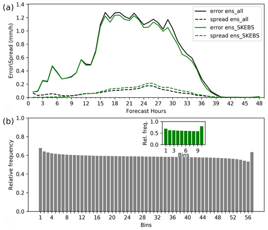 (a) the spread-skill diagram and (b) the rank histogram plot for precipitation using hourly IMERG data as observations for the WRF domain. Black lines and bars correspond to the overall ensemble, while the green ones are for the ensemble considering Stochastic Kinetic Energy Backscatter parameterization (SKEBS) members only. Valid for the simulation period starting at 00Z on 27 February 2017.