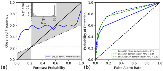 A reliability diagram [64] for the overall ensemble (ens_all) is shown in Figure 14a. The thick, black, diagonal line corresponded to a perfect ensemble while the shaded area still indicated reliability. The blue line is computed for the ensemble using a threshold of 0.1 mm to dichotomize precipitation events. Observed frequencies above 20% (dashed line) indicated reliability. The ensemble achieved this, albeit without sharpness (lack of average tilt in the blue curve). This result was expected since low or no precipitation is usually overestimated by most members in areas with a low probability of occurrence or under weak meteorological forcing. On the other hand, when the forcing was strong or in areas where the probability of precipitation is high, most members agreed to produce some precipitation but with no accuracy. For ens_SKEBS (not shown), the same characteristics remained.